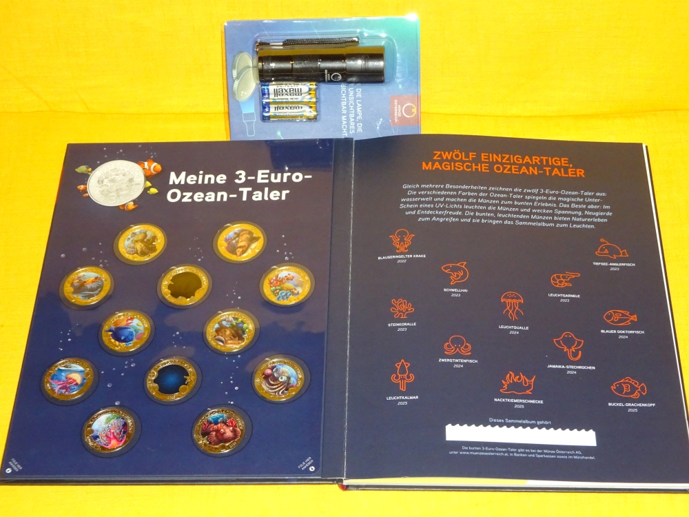 Alle 12 Stück 3 Euro Ocean-Taler der Serie - Leuchtende Meereswelten - Starterset mit Sammelalbum und UV-Lampe - UND alle 12x 3 Euro CuNi Münzen der farbigen Meerestieren -mit UV-Farbeffekt ! (die 12 Stk 1x 2022,4x 2023, 4x 2024,3x2025) - Krake, Schwellhai, Lauchtgarnele, Anglerfisch, Steinkoralle, Leuchtqualle, Doktorfisch, Zwergtintenfsich, Stechrochen, Leuchtkalmar, Nacktkiemerschnecke und Buckel-Drachenkopf - komplett lieferbar ab 10.9.2025
