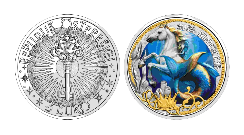 NEUE SERIE: Fantastische Fabelwesen - Die 2. Münze der 12 teiligen Serie 3 Euro Fabelwesen - in Kapseln -mit UV-Farbeffekt ! (die 12 Stk 1x 2025,4x 2026, 4x 2027,3x2028) - Der HIPPOKAMP - lieferbar ab 28.1.2026
