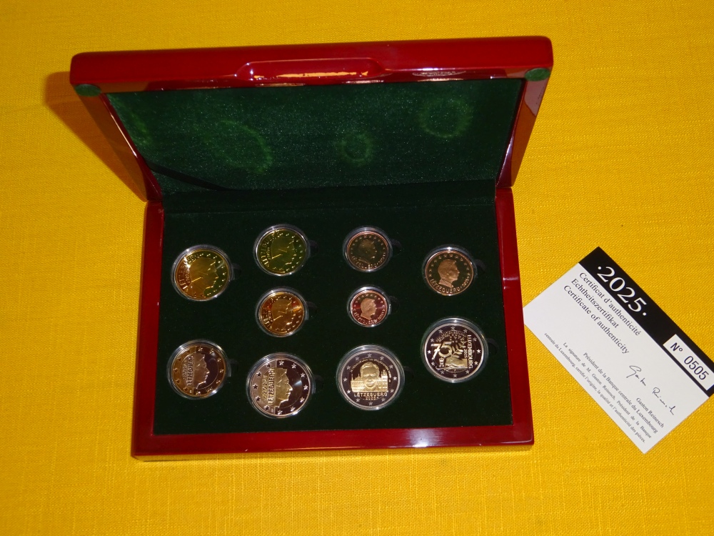 Der Kursmünzsatz 2025 in PP - in edler Holzbox - zusätzlich zu den 8 Münzen 1ct - 2 Euro in PP sind auch noch die beiden Sondermünzen 2025 ( 25. J. Thron Großherzog Henri, 75 J. Schumann Erklärung ) in Polierter Platte im Satz - lieferbar