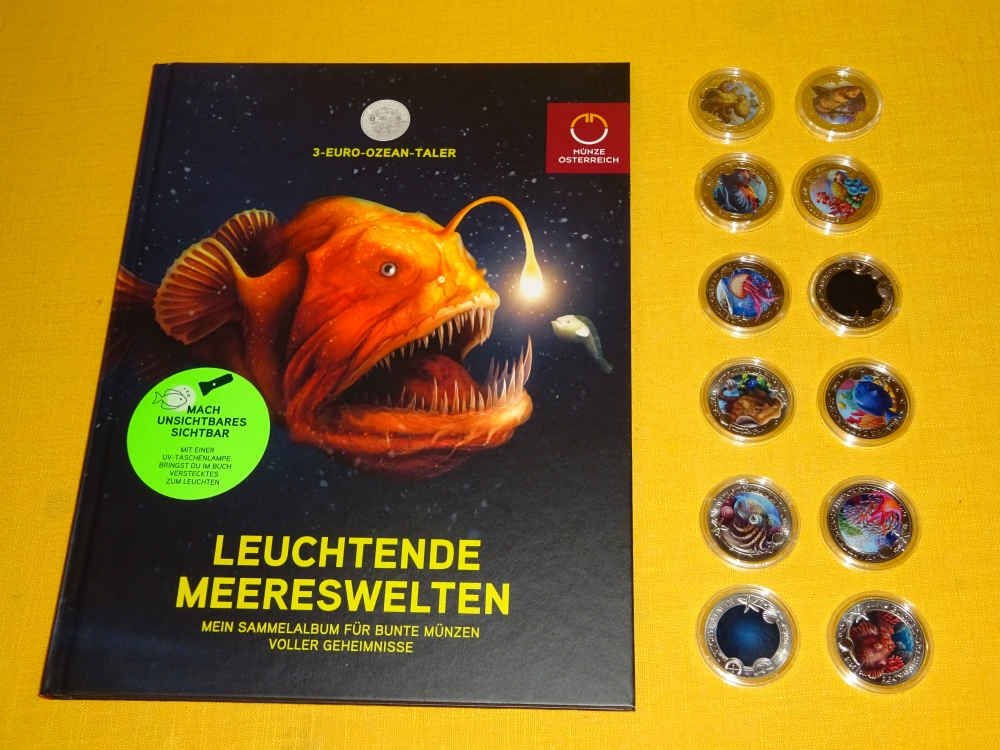 Alle 12 Stück 3 Euro Ocean-Taler der Serie - Leuchtende Meereswelten - mit Sammelalbum - UND alle 12x 3 Euro CuNi Münzen der farbigen Meerestieren -mit UV-Farbeffekt ! (die 12 Stk 1x 2022,4x 2023, 4x 2024,3x2025) - Krake, Schwellhai, Lauchtgarnele, Anglerfisch, Steinkoralle, Leuchtqualle, Doktorfisch, Zwergtintenfsich, Stechrochen, Leuchtkalmar, Nacktkiemerschnecke und Buckel-Drachenkopf - komplett lieferbar ab 10.9.2025 |
